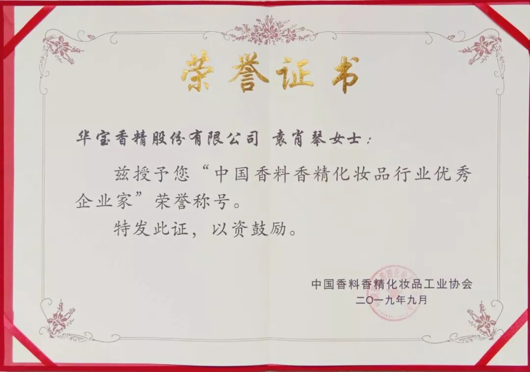 华宝股份董事、总裁袁肖琴女士荣获“中国香料香精化妆品行业优秀企业家”荣誉称号
