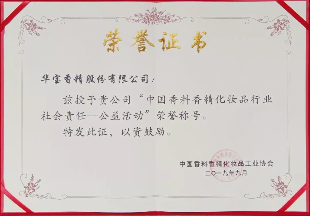华宝香精股份有限公司荣获“中国香料香精化妆品行业社会责任—公益活动”荣誉称号